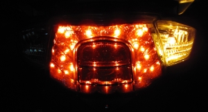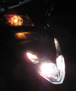 ホンダ・インサイトに似たメーターパネルにはアナログ式タコメーターも付いている。スイッチをONにするとメーターを一回振り切るスイープ機能がある。ヘッドライトはメイン2灯+ポジション2灯=で常に4灯が点灯している。前方投影面積に占めるライト面積がとても広く前方からの被視認性は申し分ない。両ウインカーもポジションランプとして常時点灯させておけば更に安全性が増すだろう。照射力も35Wと思えないほど明るいが、照射範囲はそれほど広くなく照射されているところとそうでないところの輝度差が大きい。マルチリフレクト効果が少し弱い。暗黒の峠道では時折、ハイ/ローを切り換えることがあった。シグナスX-FIと比べて明らかに劣る点があるとすれば、これくらいである。