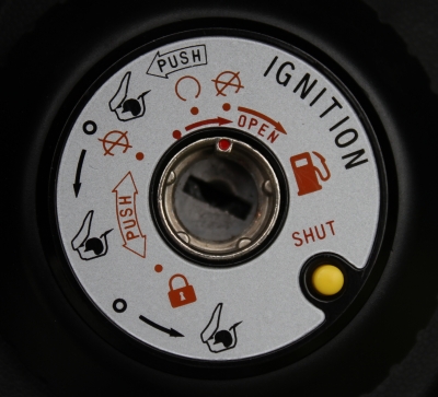 メインスイッチは絵柄だけ見ていると分かりづらいが、使ってみると良く考えたものだと感心した。スイッチを一番右まで回すと勢いよく給油口が開く。OFF⇒ON⇒OFF⇒FUEL。エンジンOFFの位置が二か所あるのでハンドルロック解除状態から給油口を開こうとするとONの位置でいったんライトが点灯することになるが、走行直後に給油する場合、スイッチをいったん左に戻さなくても、右に回すだけで給油口を開くことができるのだ。一方でスイッチを左に回すと、OFF⇒OPEN、OFF+PUSH⇒LOCK⇒OPEN。つまりハンドルロックする前にも・した後にもシートオープンできるのだ。